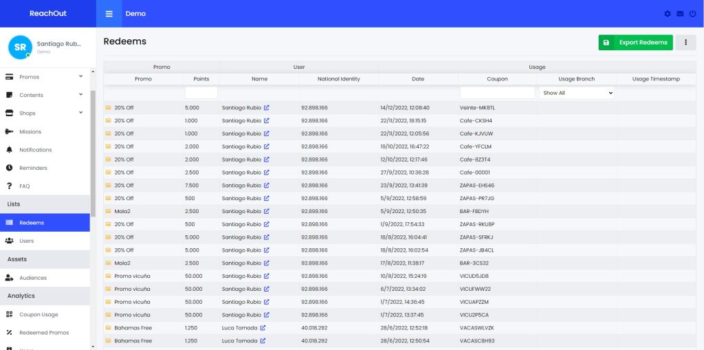Sí, en la sección Redeems se indica si el cupón fue utilizado, en qué sucursal y la fecha y hora de la compra.